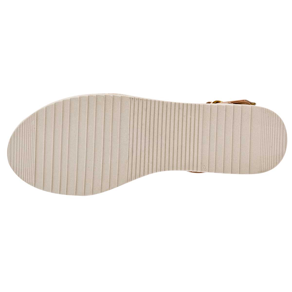 Tiene un diseño sencillo y elegante, con una tira ancha que cruza el empine y se ajusta con una hebilla en el tobillo. La plataforma es gruesa y cómoda,  y el contraste entre el color beige de la parte superior y el color natural de la plataforma le da un toque moderno.