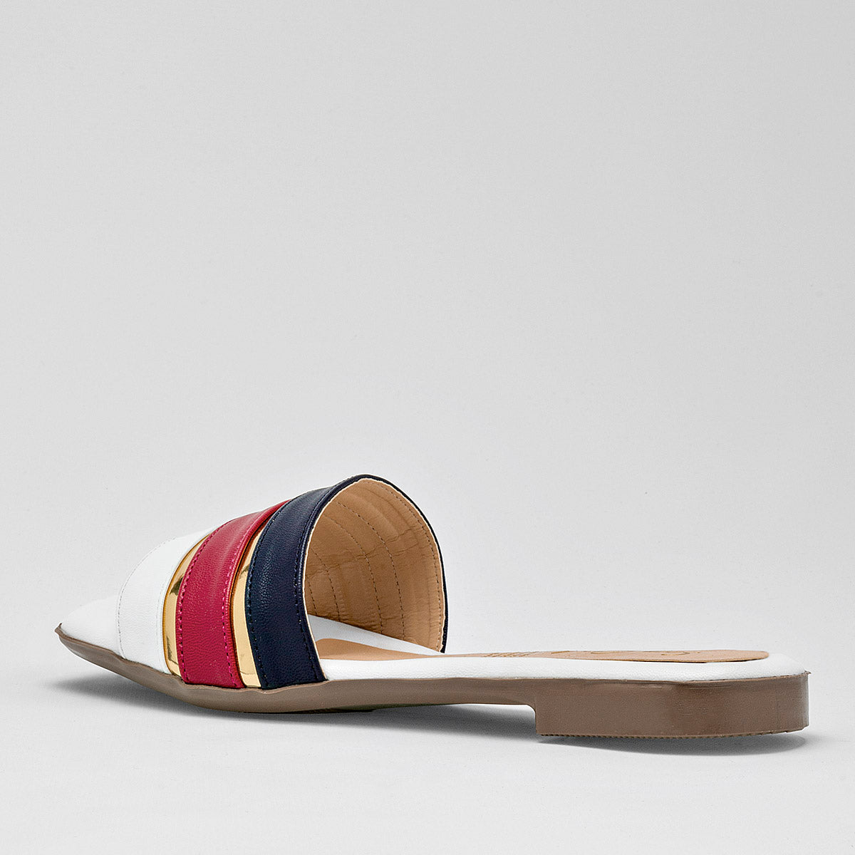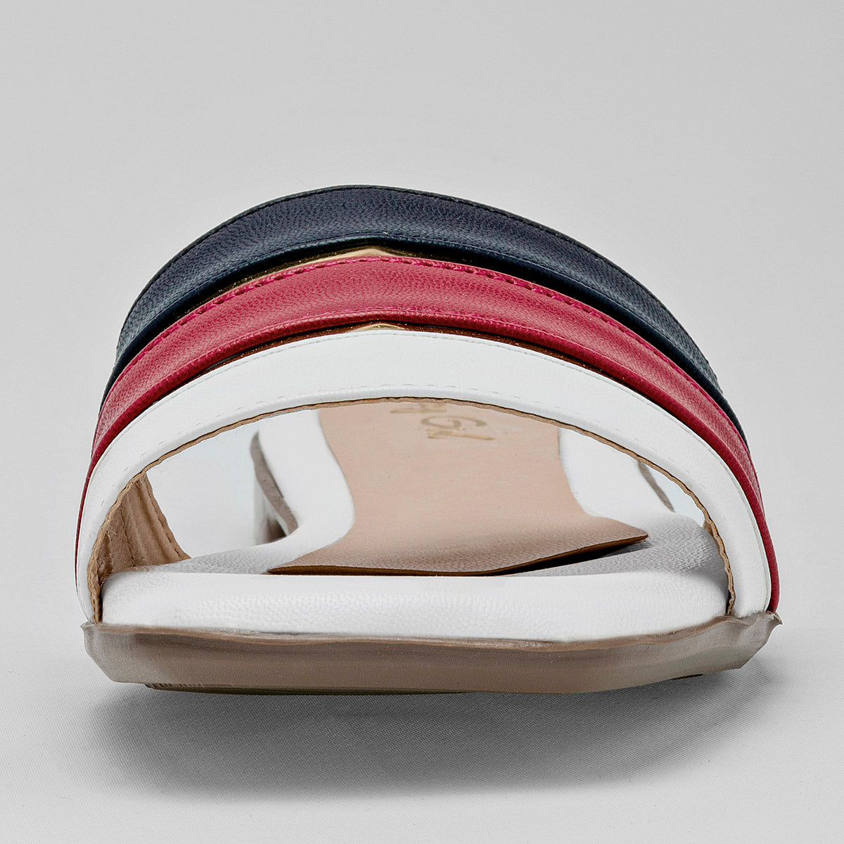 Sandalia tipo boca de pescado presenta un diseño distintivo que combina estilo y comodidad. En la parte superior, el empeine se destaca por tres correas entrelazadas. La primera correa, de un blanco puro.  La segunda correa, en un rojo vibrante. La tercera correa, en un tono marino profundo.La suela, diseñada para brindar estabilidad y comodidad, complementa perfectamente el estilo moderno de esta sandalia.