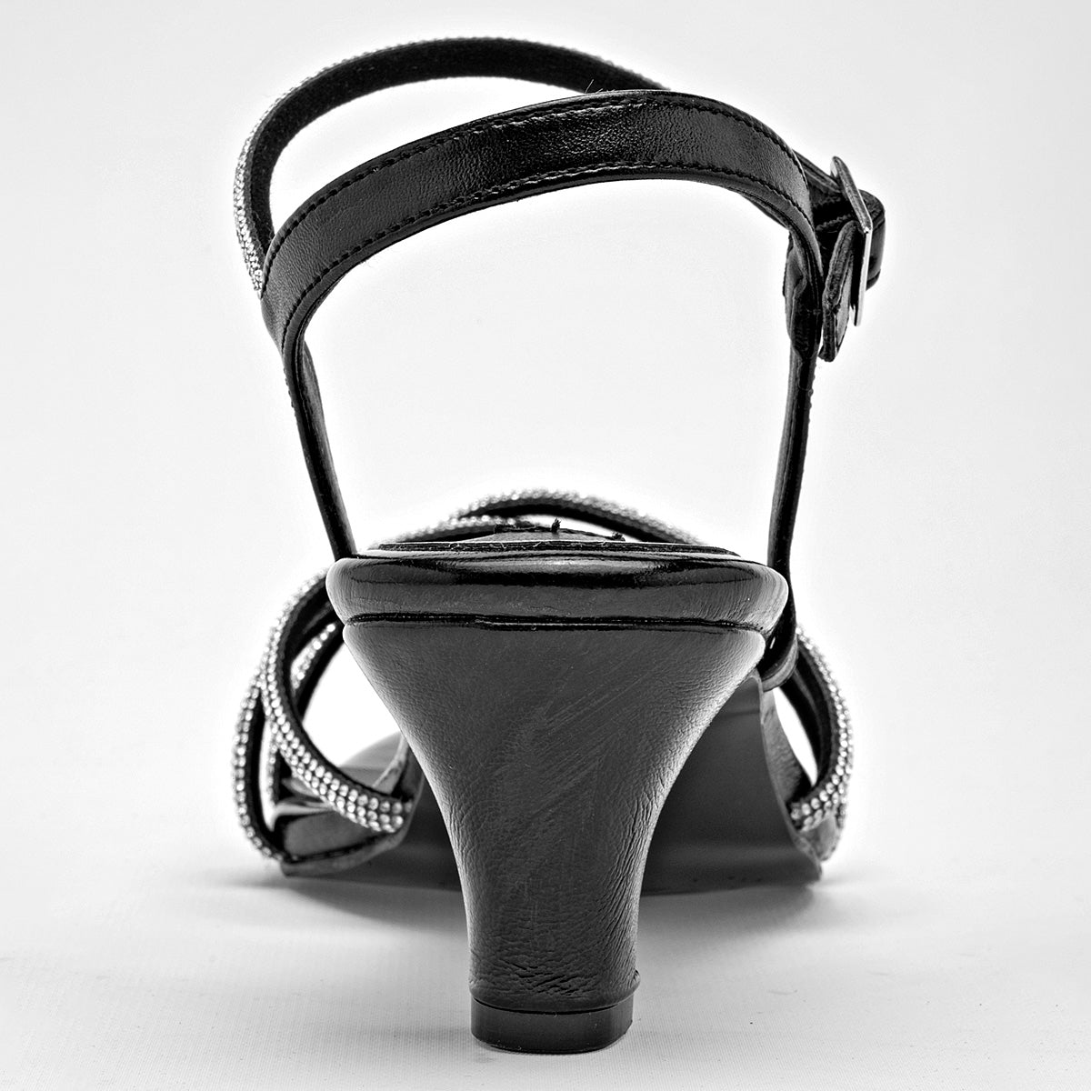 Se trata de una zapatilla de tacón bajo y fino de 5 cm. El calzado es de color negro liso, con una silueta elegante y minimalista. Destaca por sus finas tiras decoradas con pedrería que cruzan la parte frontal del pie, dándole un toque de brillo y sofisticación. Cuenta con una tira ajustable al tobillo, también con pedrería, que se cierra con una hebilla metálica de color plata.