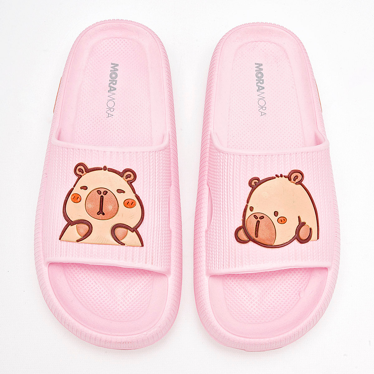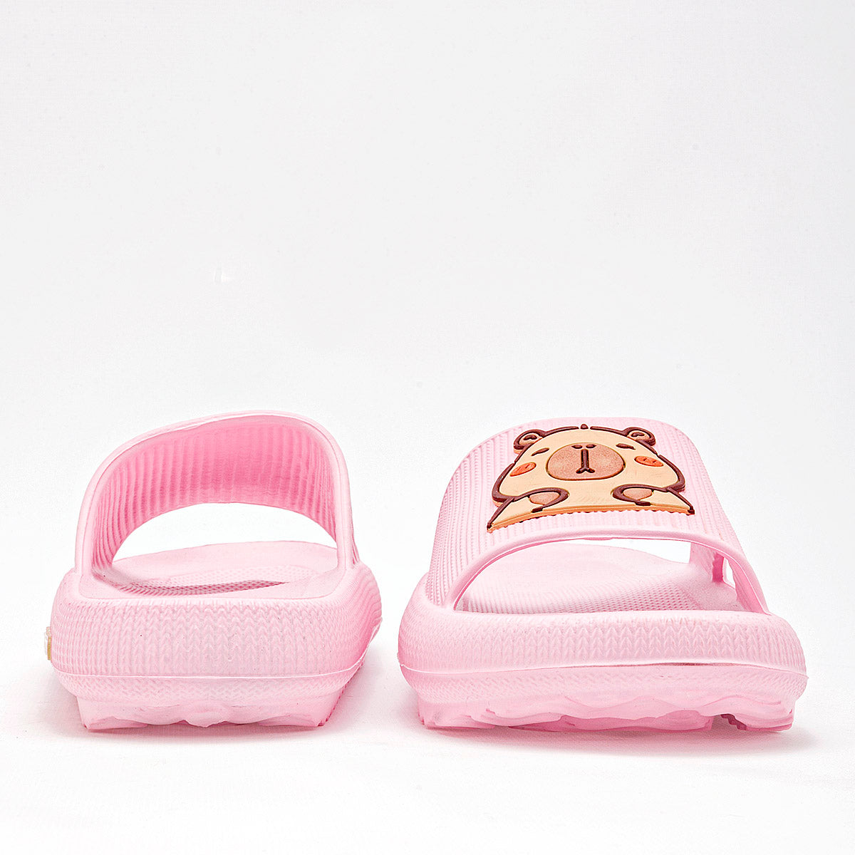 Presenta un diseño de banda ancha en la parte superior, adornada con una ilustración de un oso de estilo kawaii. El calzado cuenta con una suela gruesa y texturizada, que ofrece un estilo divertido y comodidad para el uso diario.