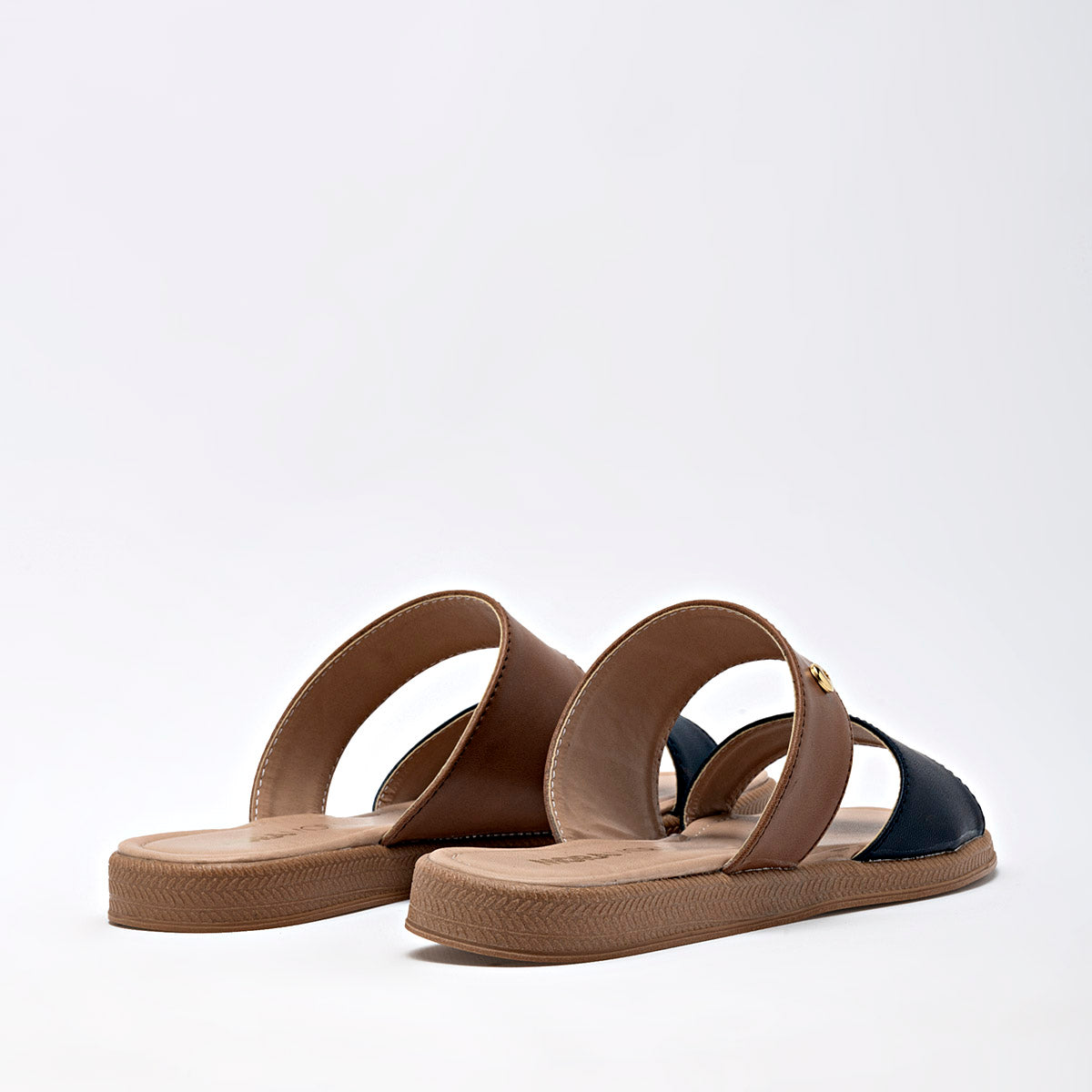 Sandalias de estilo pala, con un diseño moderno y minimalista que combina dos colores. La suela es plana, con una base en un tono beige claro que ofrece comodidad y ligereza. La parte superior está compuesta por dos tiras anchas, una en un tono marrón claro y la otra en azul marino, creando un atractivo contraste. Un pequeño broche metálico en la tira superior añade un detalle de calidad. El diseño es abierto, lo que las hace fáciles de poner y quitar.