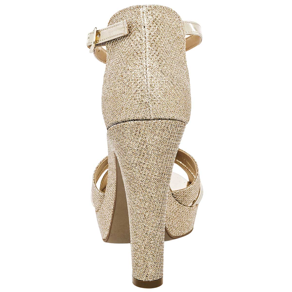 Zapatilla chinela en tiras, corte en glitter dorado. Cuenta con ajuste de cinto y hebilla. Suela de media plataforma y tacón separado