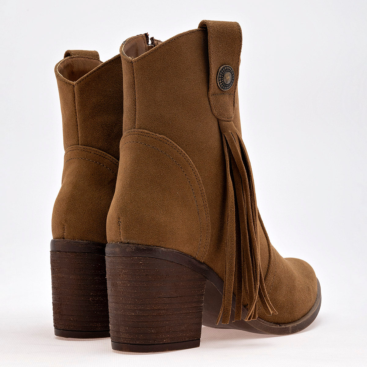 Este botón vaquero presenta un estilo moderno y sofisticado, perfecto para destacar en cualquier ocasión. La punta del botín es puntiaguda, lo que le otorga un toque de distinción y un aspecto estilizado a tus pies. Cuenta con un adorno de motas, que añade un atractivo detalle de diseño y le da un toque ligeramente bohemio.