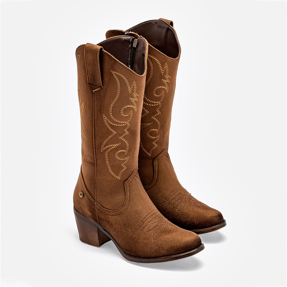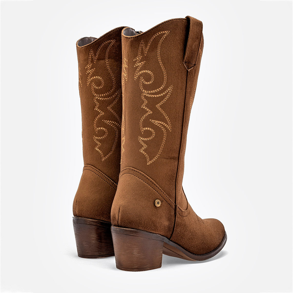 Cuenta con una punta ligeramente puntiaguda y una caña que llega aproximadamente a la mitad de la pantorrilla. La caña suele tener un bordado o patrón decorativo, típico de las botas vaqueras, que le añade un toque distintivo. Para facilitar el calce, cuenta con un cierre lateral.