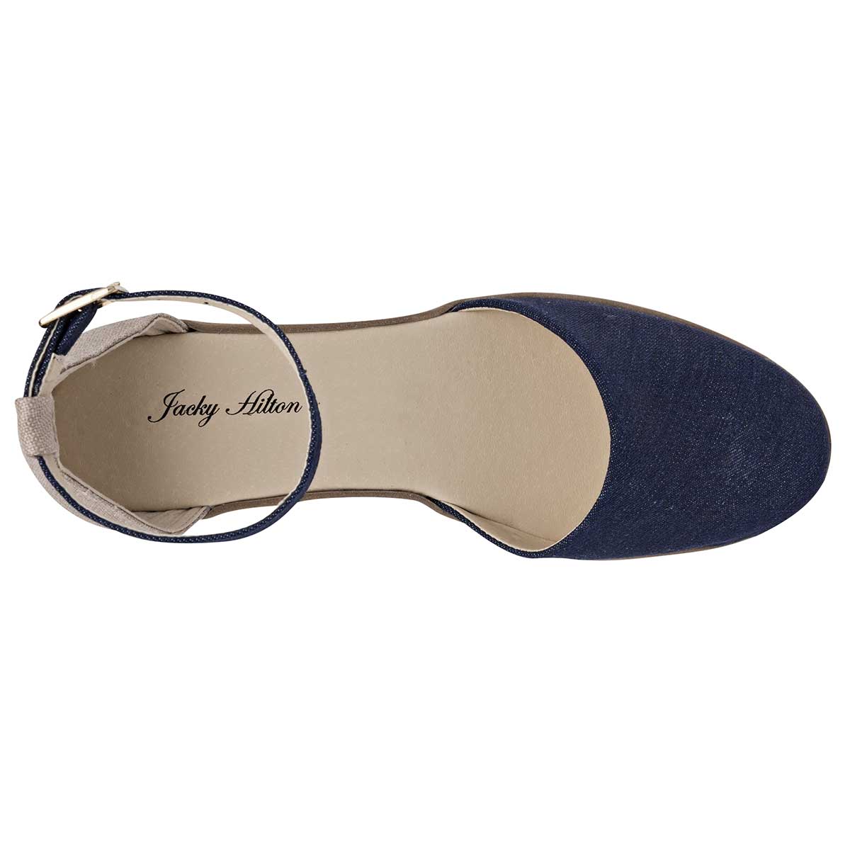 Presenta un diseño sencillo y moderno, con una tira ancha que cruza el empine y se ajusta con una hebilla en el tobillo. La cuña es gruesa y cómoda, lo que proporciona altura sin sacrificar la estabilidad.