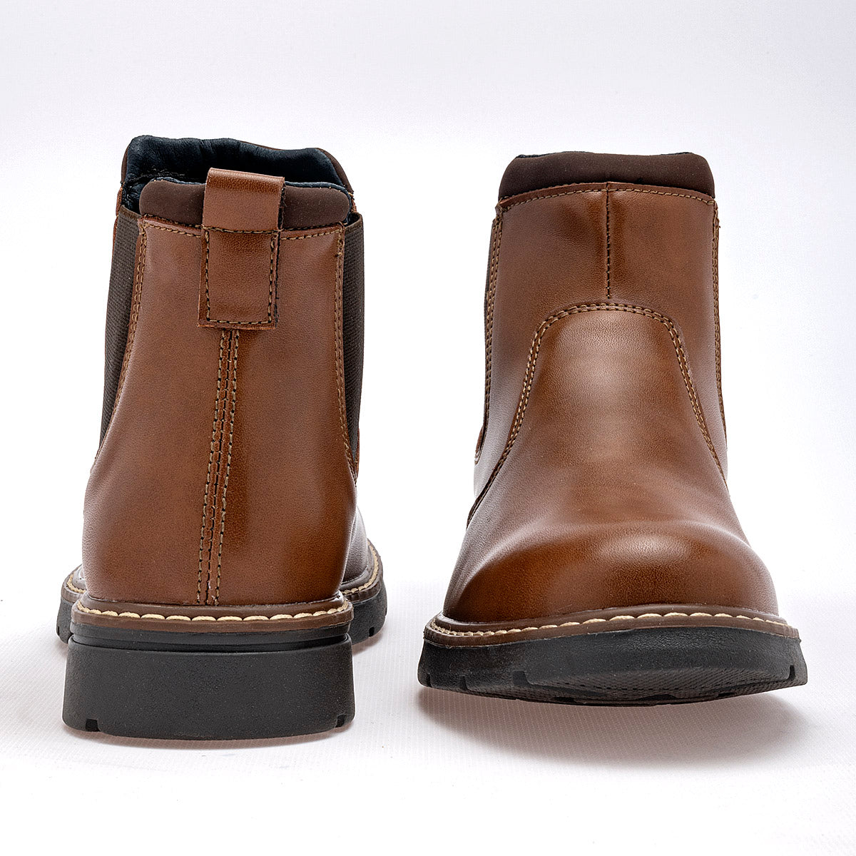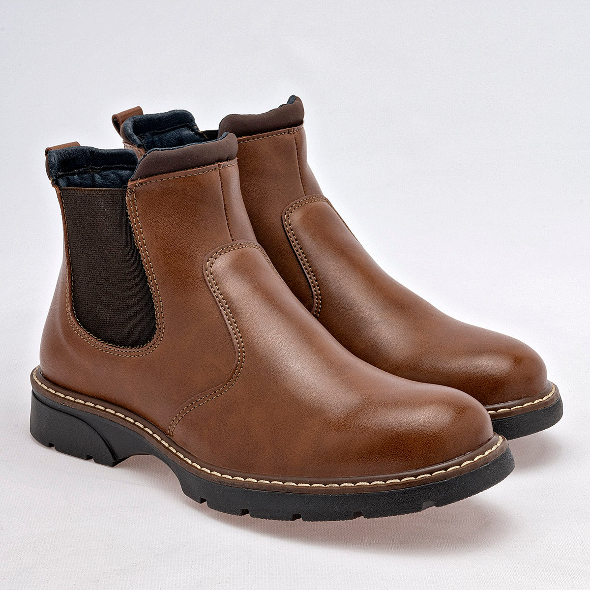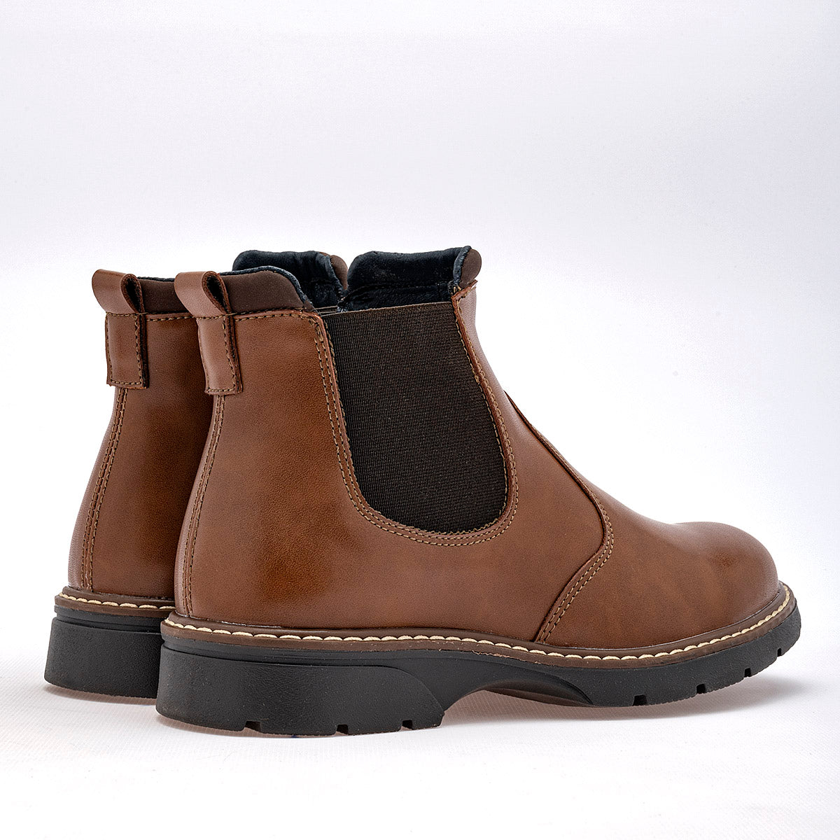 Estas botas, de un elegante color café, están confeccionadas con un corte de piel sintética de alta calidad que les otorga un aspecto cómodo y duradero. Su suela sintética proporciona un agarre óptimo en cualquier superficie, mientras que su forro interior suave garantiza la máxima comodidad durante todo el día. El diseño Chelsea con cierre elástico lateral facilita el calce y descalce.