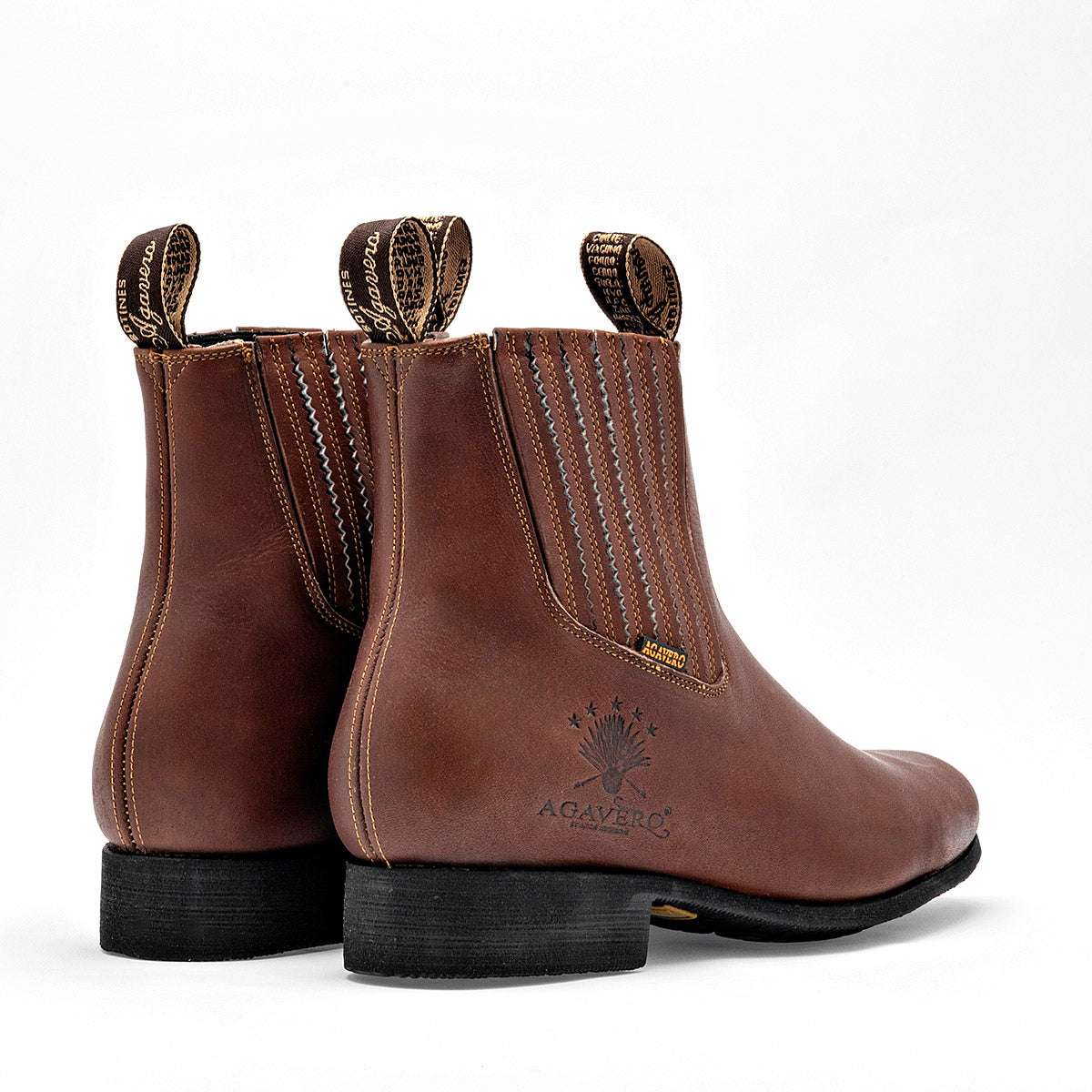 Bota de color marrón oscuro hecha de cuero. Tiene un diseño clásico de vaquero con un tacón bajo y una punta redonda. La bota tiene una tira en la parte superior que se puede tirar para facilitar la puesta.