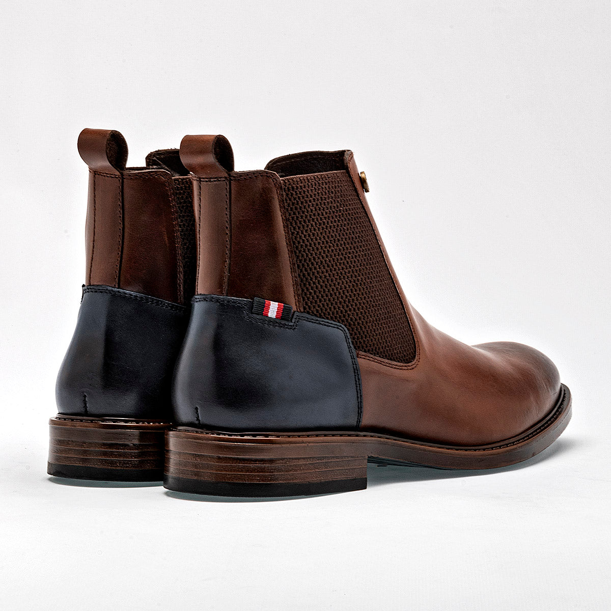 Este modelo de botas presenta un diseño elegante y atemporal. Está confeccionado en cuero de alta calidad. La silueta es pulida y estilizada. El panel lateral elástico, característico del estilo Chelsea, está finamente tejido con una textura sutil que añade contraste y facilita el calce. Además, un tirador de tela en la parte trasera permite ponerlas con facilidad. La suela de goma resistente asegura durabilidad y confort para el uso diario.