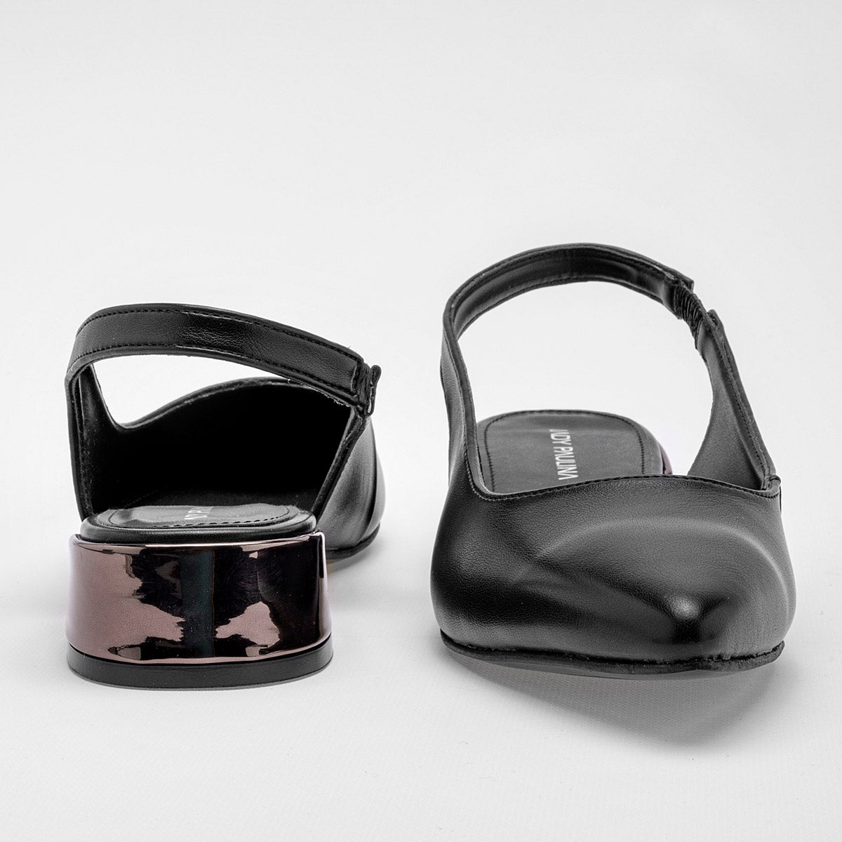 Se trata de un zapato de tacón bajo con un diseño clásico y un toque moderno en el tacón. Su puntera es puntiaguda con diseño clásico que estiliza el pie y añade sofisticación. La sandalia es de tipo slingback, lo que significa que tiene una correa que se ajusta alrededor del talón.