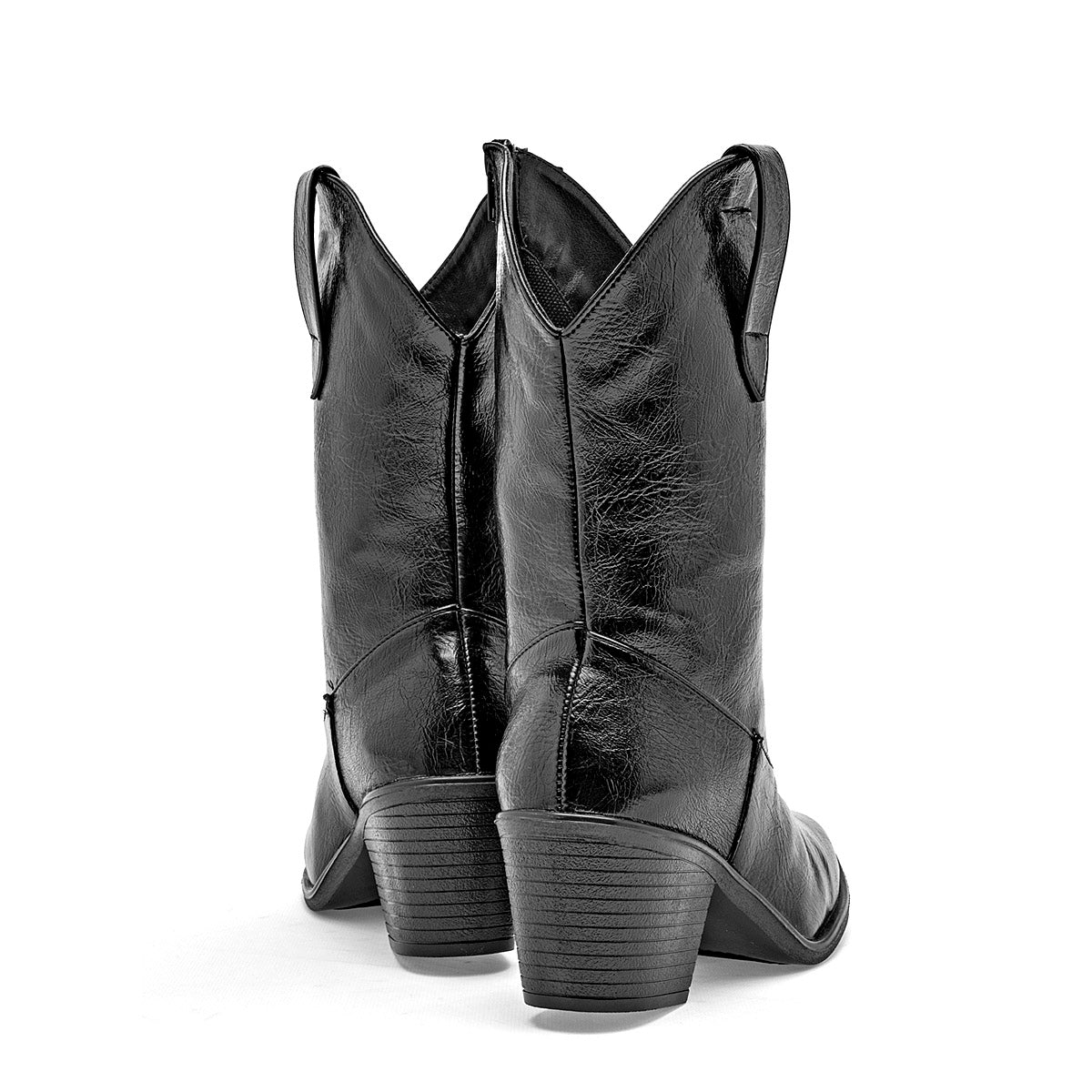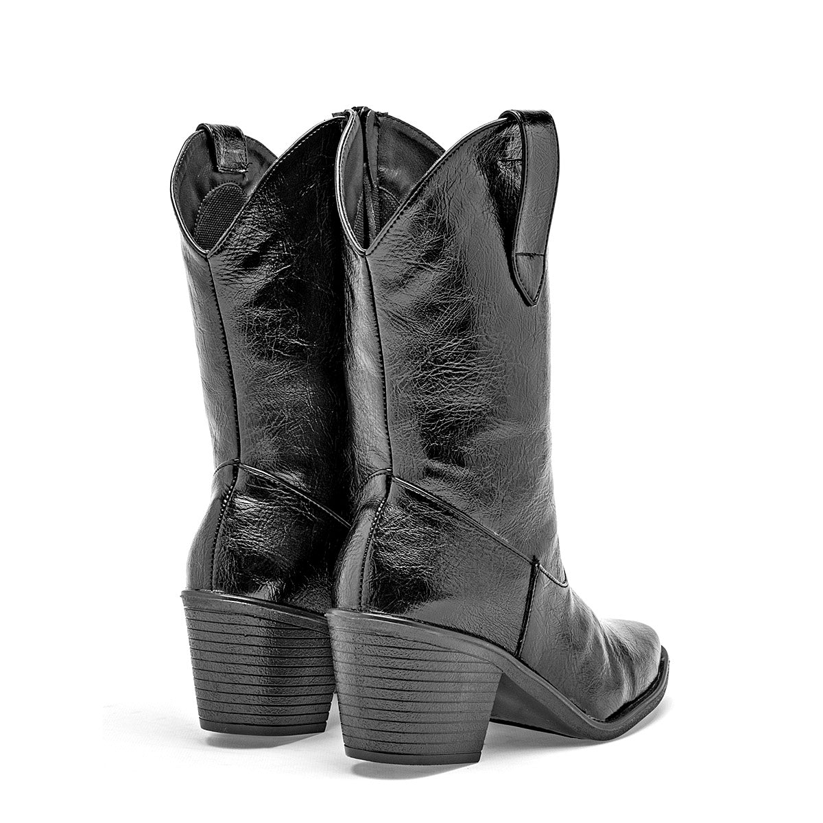 Presenta la silueta característica de las botas vaqueras, con una caña que sube hasta la mitad de la pantorrilla y una abertura en forma de "V" en la parte superior frontal. Cuenta con una punta afilada, que estiliza el pie y añade un toque de elegancia al diseño vaquero. Incorpora un tacón cubano robusto y biselado, de altura media, que proporciona comodidad y estabilidad.