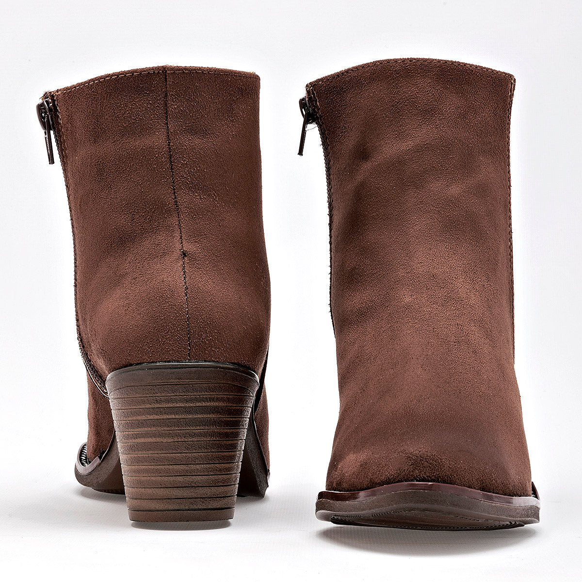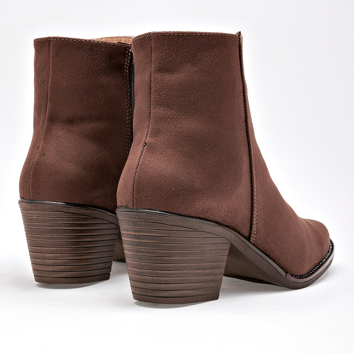 Este elegante botín con un marcado estilo vaquero, está confeccionado en un suave material de gamuza. Su diseño de caña media-baja se ajusta cómodamente al tobillo. Lo que destaca es el detalle de pedrería de fantasía en la parte frontal de la suela, que bordea la punta del calzado, añadiendo un toque de brillo y sofisticación. Complementando su estilo, cuenta con un tacón cubano robusto de altura media que proporciona estabilidad y comodidad al caminar.
