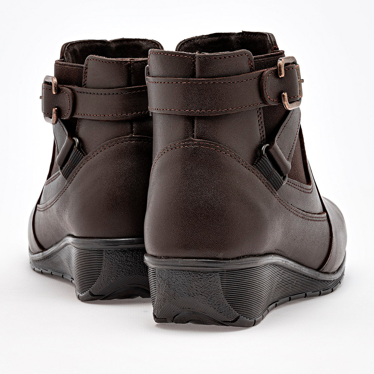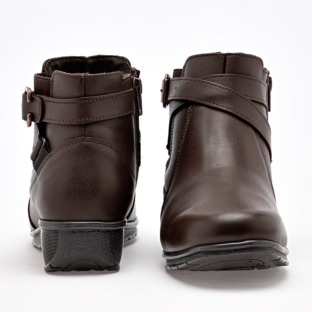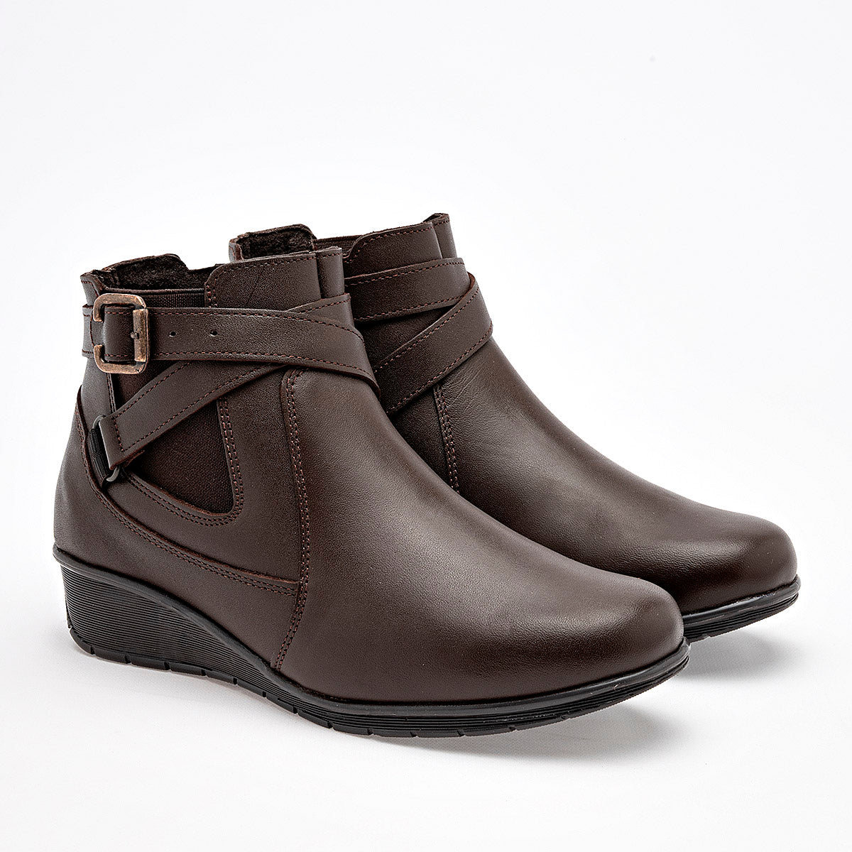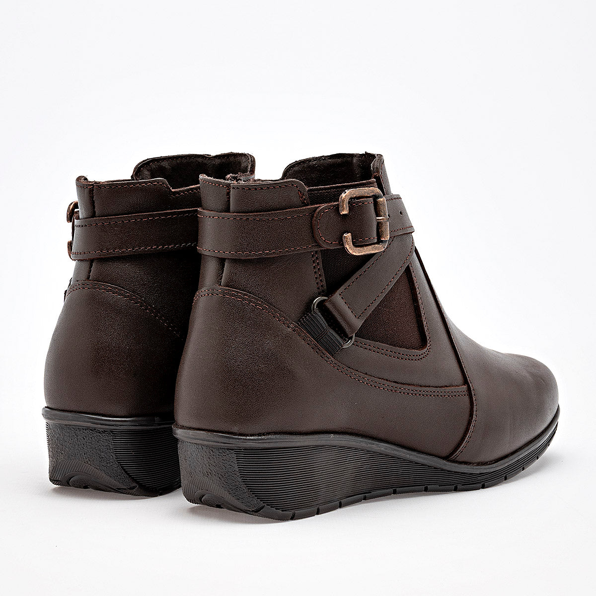 Su diseño versátil presenta un práctico cierre de cremallera lateral que asegura un calce fácil y un ajuste perfecto. La caña del botín está adornada con una tira decorativa que cruza el tobillo y se ajusta con una hebilla metálica en tono bronce, añadiendo un toque distintivo y un aire moderno. Un panel elástico lateral, proporciona mayor flexibilidad y comodidad al caminar. La suela incorpora una cómoda cuña integrada, que ofrece una elevación sutil y estable.