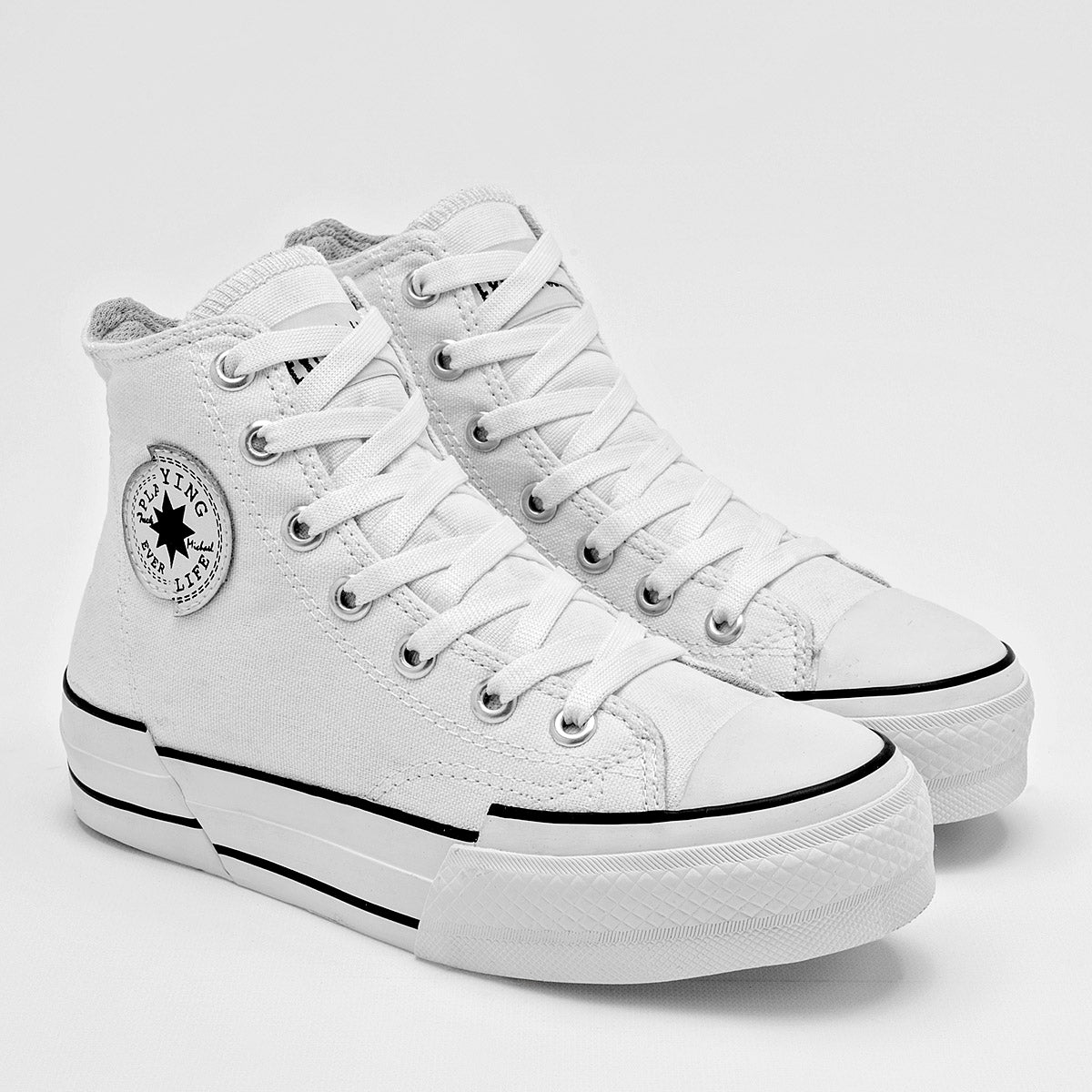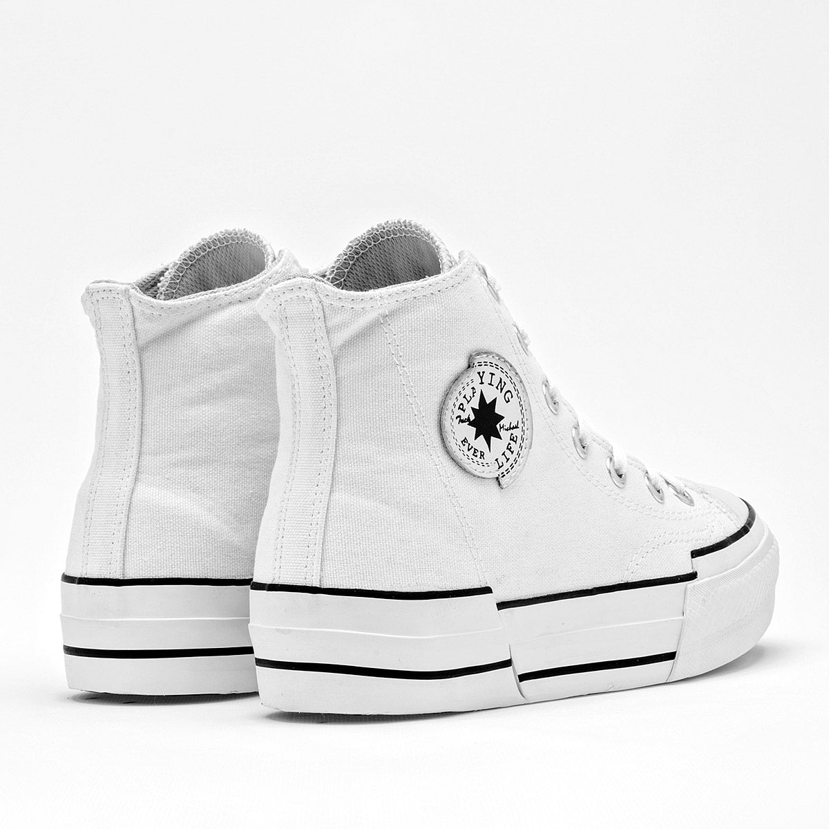 Su característica más distintiva es una plataforma muy alta y robusta, que incorpora detalles de líneas horizontales negras y una suela texturizada para un estilo moderno y audaz.