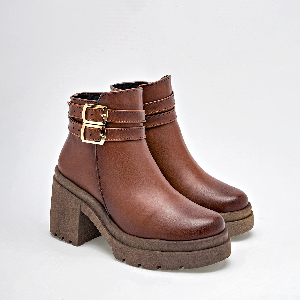 Confeccionado en un material liso que presenta una impactante plataforma delantera y un tacón de bloque de 8 cm, lo que le confiere una elevación considerable y una silueta imponente, sin sacrificar la estabilidad gracias a la amplitud del tacón y la plataforma. La suela tipo track complementa su estética robusta y ofrece un buen agarre.