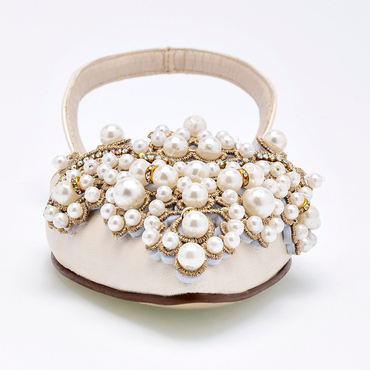 ¡Deslumbra con cada paso en estos elegantes zapatos de piso beige nacarado con perlas frontales y un ajustador de talón, fusionando la sofisticación con la comodidad para realzar tu estilo con un toque de glamour único!