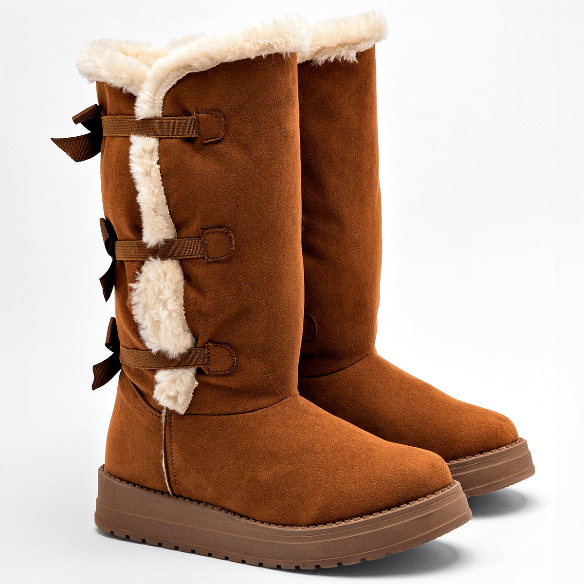 Estas botas son la combinación perfecta de calidez y moda. Su exterior de suave gamuza en color camel se combina a la perfección con un acogedor forro interior de pelo sintético, brindándote una sensación de suavidad y calidez en cada paso. Los detalles de lazos decorativos añaden un toque femenino, mientras que su suela sintética plana y flexible te garantiza comodidad durante todo el día. Ideales para completar tus looks más invernales.