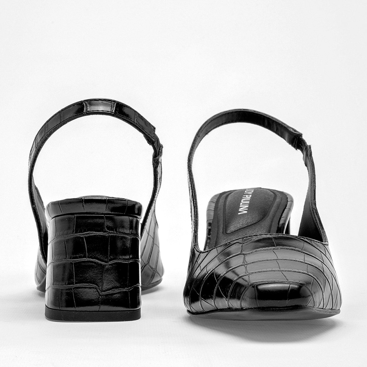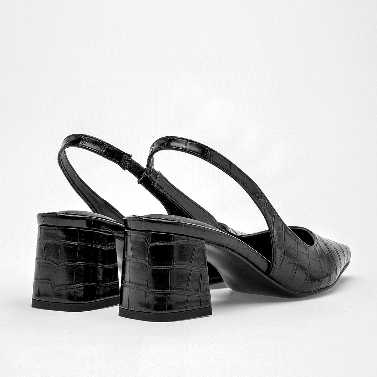 Este es un elegante y sofisticado zapato tipo slingback con tacón de bloque bajo, que presenta un diseño clásico con una textura moderna. El material principal es un sintético con un estampado o textura que imita la piel de cocodrilo, lo que le confiere un aspecto lujoso y de alta costura. Este acabado texturizado le da profundidad y un interés visual adicional. La característica distintiva es la correa elástica que rodea el talón, lo que permite un calce fácil y cómodo, manteniendo el pie en su lugar.