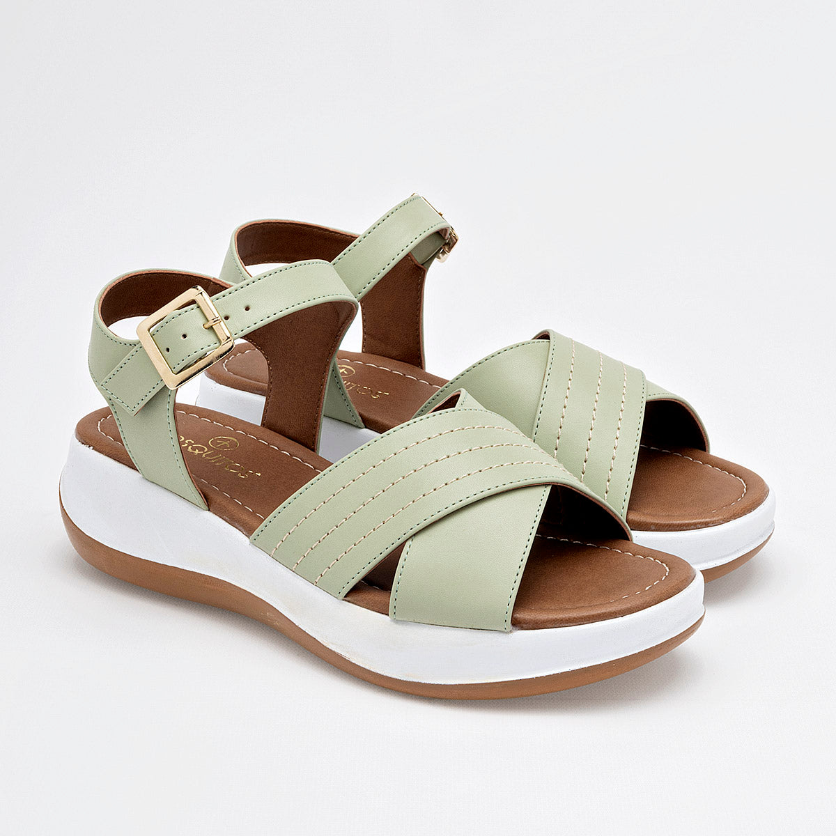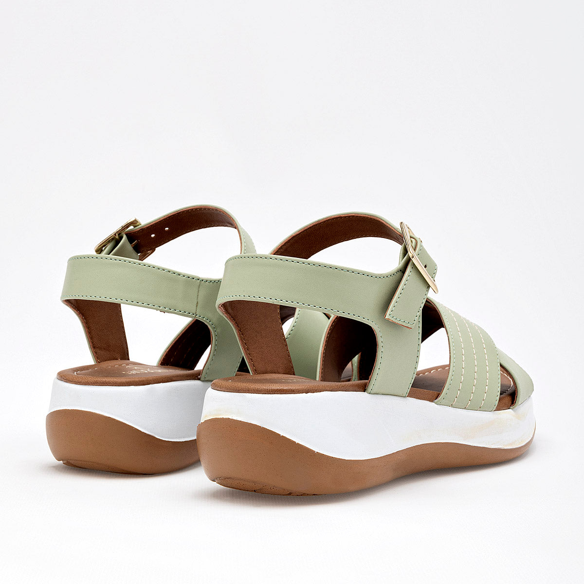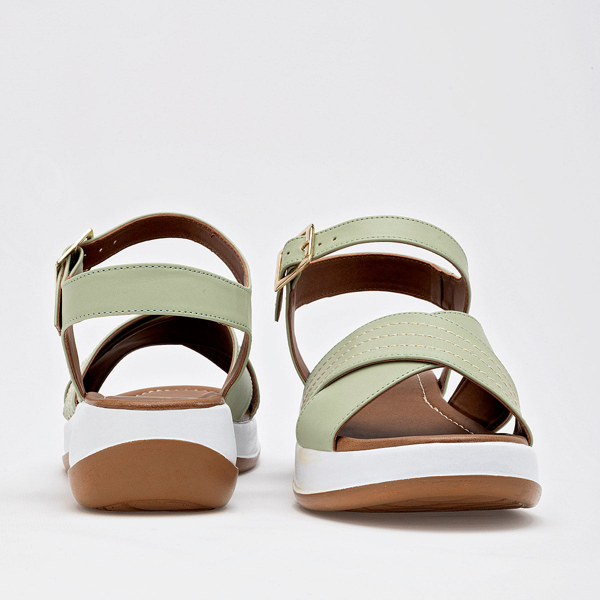 Cuenta con un diseño de tiras cruzadas sobre el empeine, con un detalle de costuras horizontales que le añaden textura y un toque artesanal. Posee una tira ajustable con hebilla dorada alrededor del tobillo, lo que permite un ajuste seguro y personalizado al pie. El tacón tiene una altura de 4 cm, proporcionando una elevación cómoda y estable sin ser excesiva.