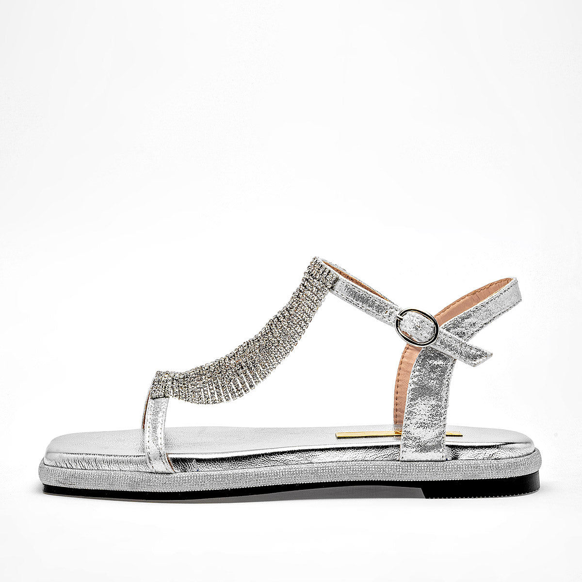 Sandalia plana para mujer en color plata, con un acabado brillante. El diseño se distingue por una tira delgada en el empeine, adornada con una cascada de cadena plata. Cuenta con una tira trasera ajustable al tobillo, que le da un ajuste seguro y un toque de glamour.